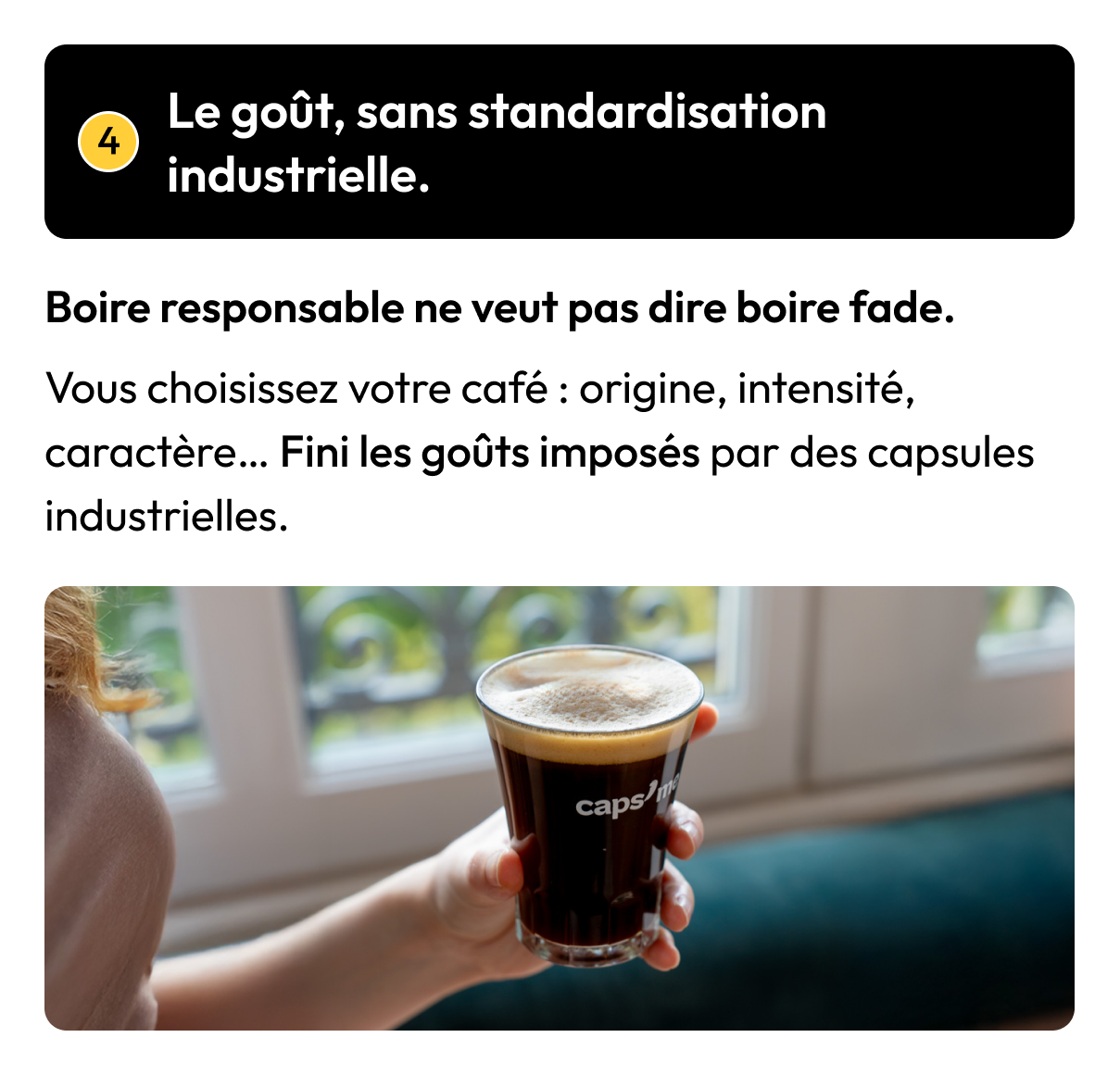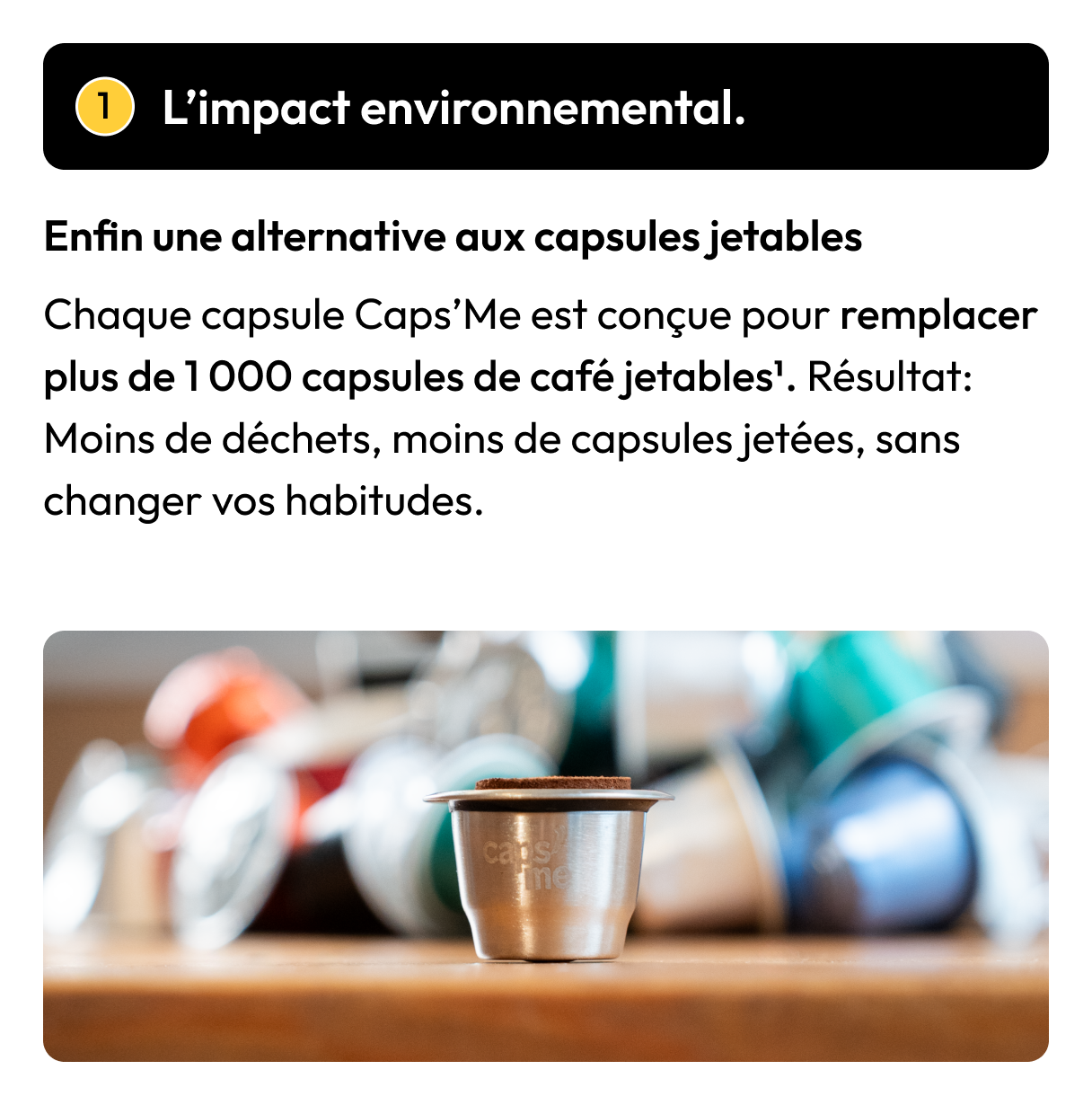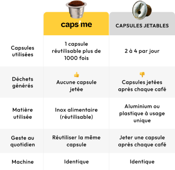 Chaque capsule Caps’Me est conçue pour remplacer plus de 1 000 capsules de café jetables¹. Résultat: Moins de déchets, moins de capsules jetées, sans changer vos habitudes.