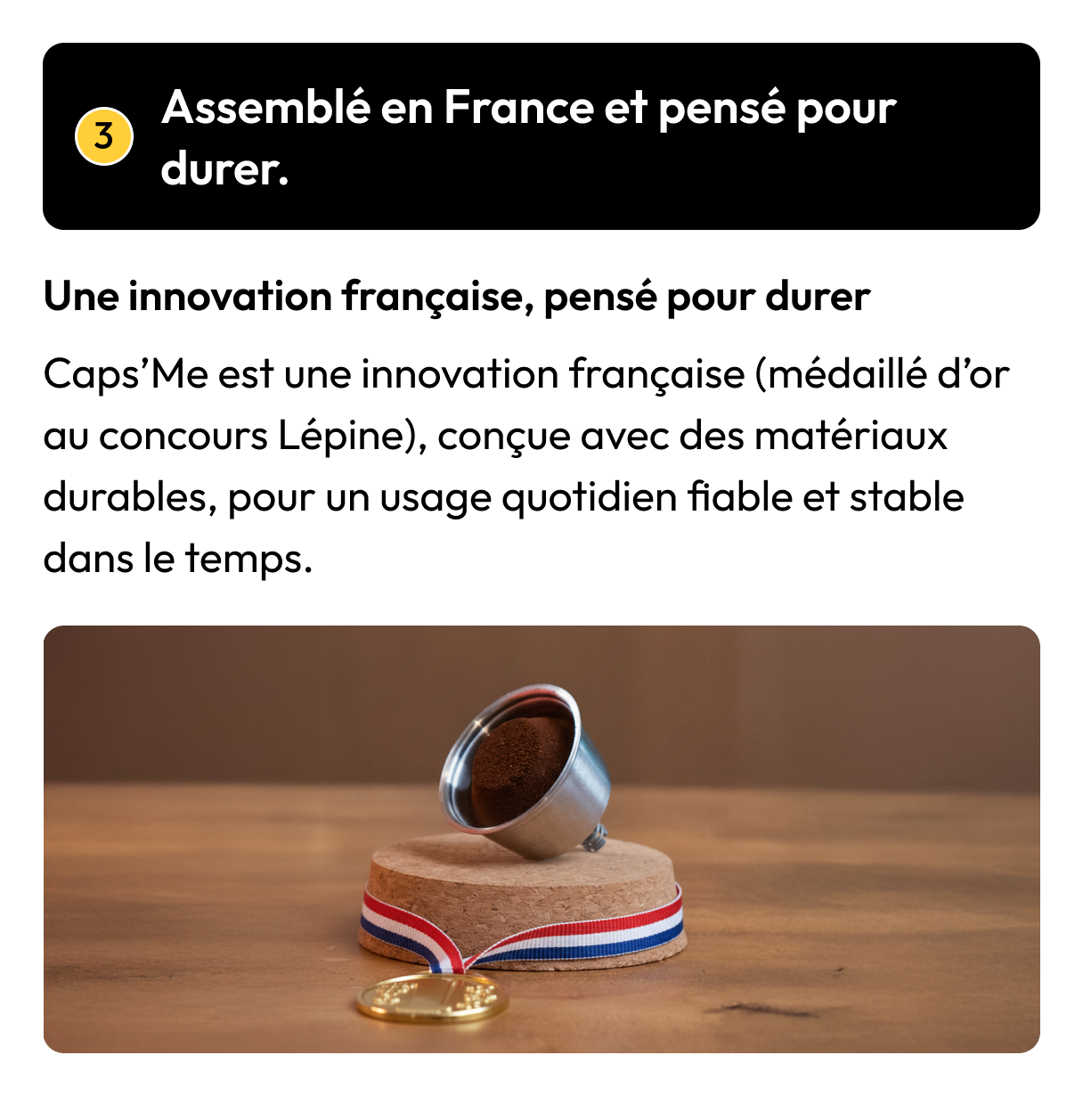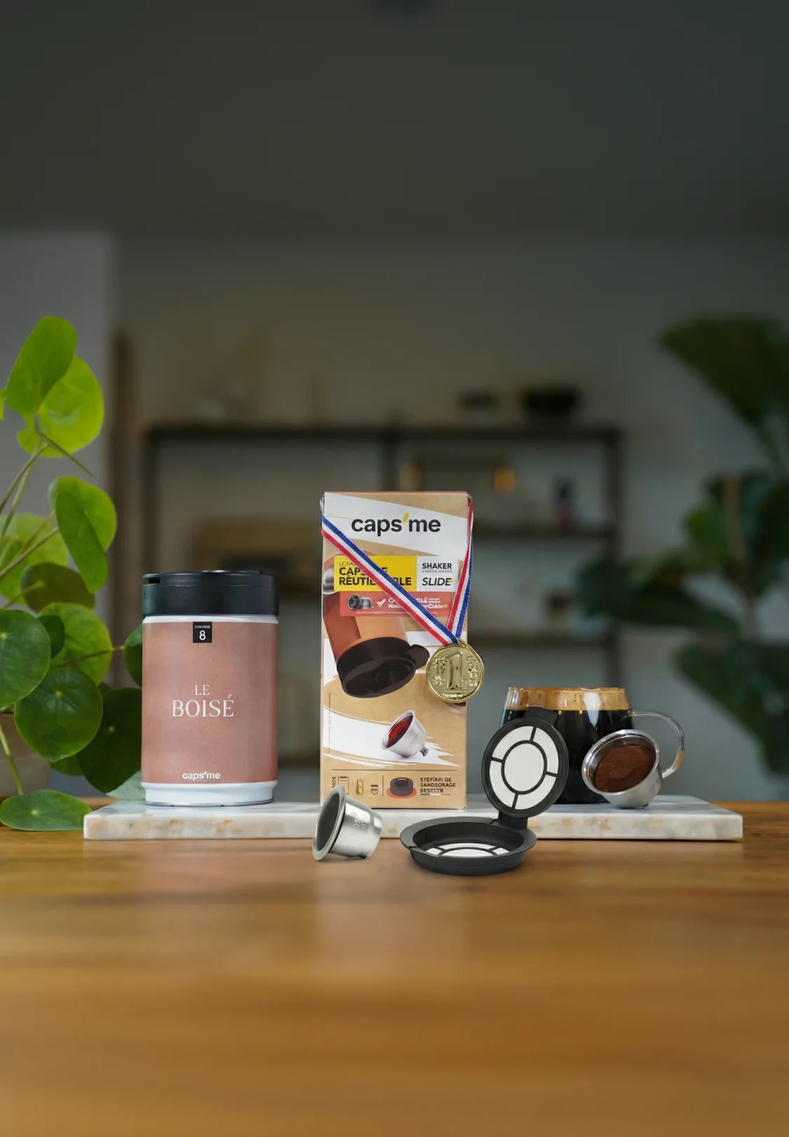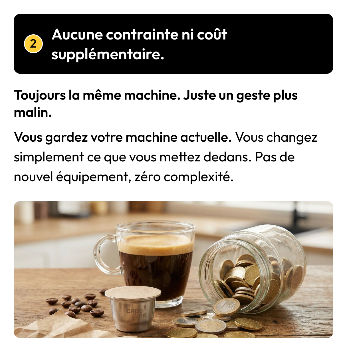 Pour faire simple : avec Caps’Me, vous achetez le coffret une seule fois (39,90€) et vous ne payez ensuite que le café moulu (et l’opercule). Le coffret est réutilisable jusqu’à 1 000 cafés par capsule, donc il s’amortit très vite.