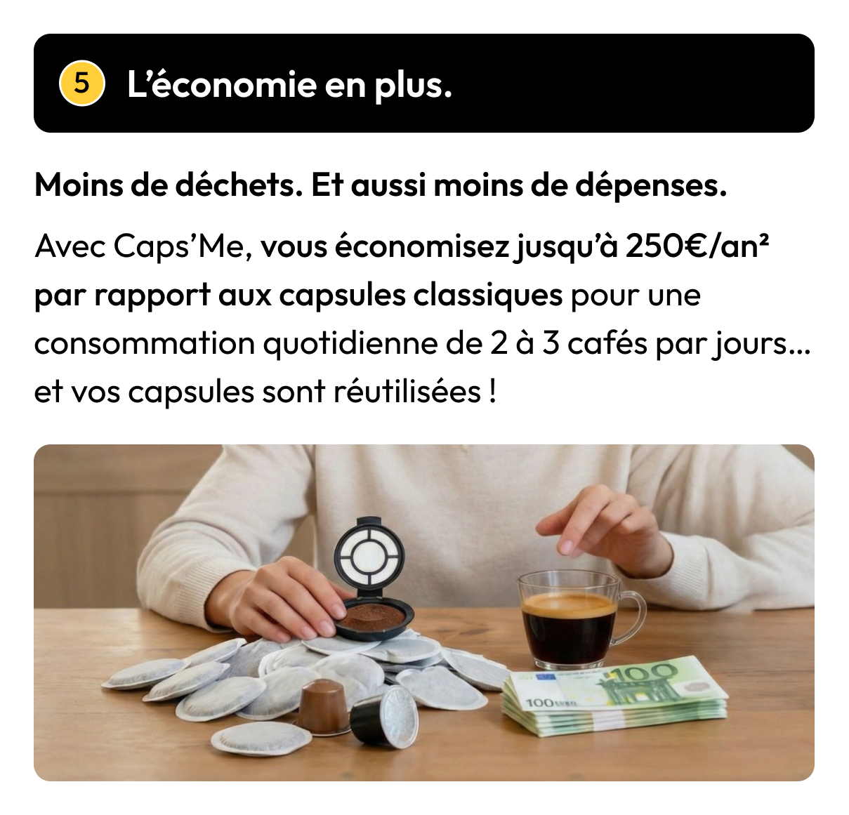 Avec Caps’Me, vous économisez jusqu’à 250€/an² par rapport aux capsules classiques pour une consommation quotidienne de 2 à 3 cafés par jours… et vos capsules sont réutilisées !